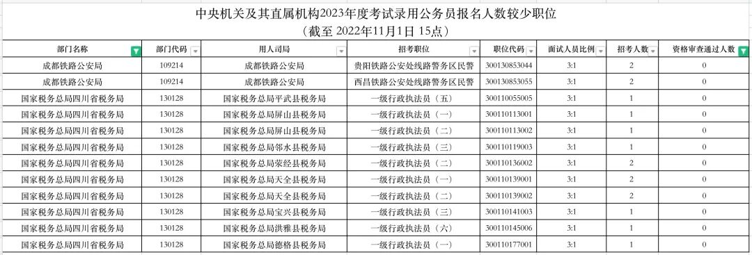 11月1日,国家公务员局官网发布《中央机关及其直属机构2023年度考试录用公务员报名人数较少职位》,经梳理发现,部分在四川岗位报名人数较少,甚至资格审查通过人数为0。