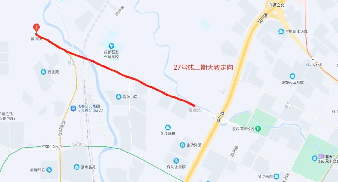 据悉成都地铁27号线一期工程起于新都区石佛站,途径金牛区,止于青羊区蜀鑫路站。本次二期线路规划预计将从蜀鑫路继续向西延伸至黄田坝站。