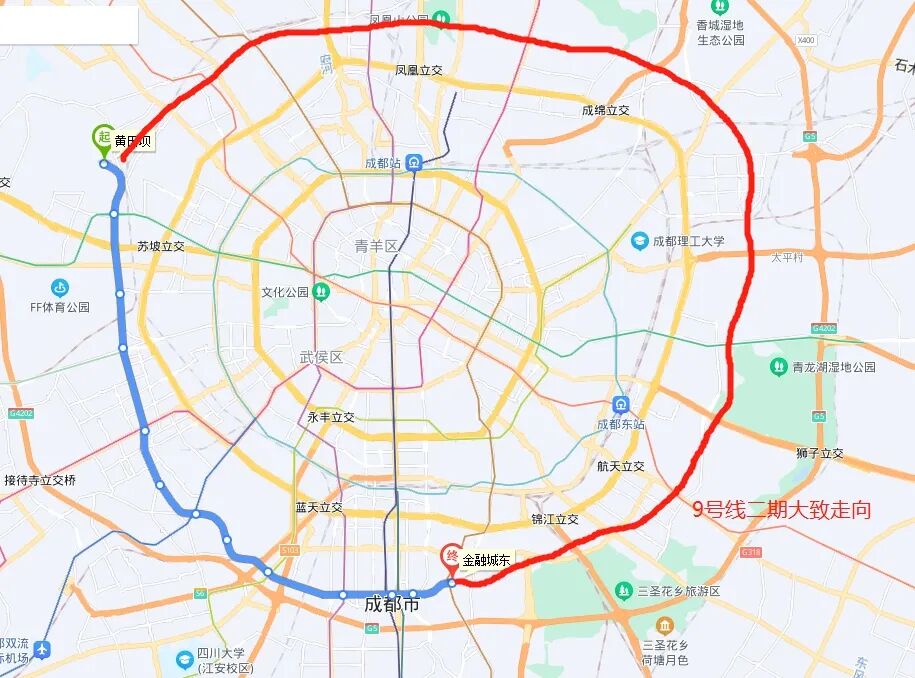 成都地铁9号线为成都第二条环形线路,大致沿3.5环呈环状走向。现9号线一期工程已经开通,东起黄田坝站,途经武侯区、成都高新技术产业开发区,终点止于锦江区金融城东站。9号线二期开建,将让9号线成环,无缝链接5+1区。