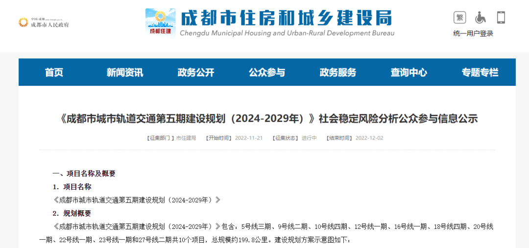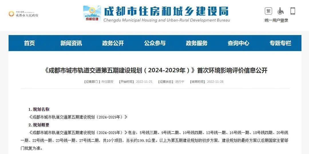 近日,成都市住房和城乡建设局发布了关于《成都市城市轨道交通第五期建设规划(2024-2029年)》首次环境影响评价信息公开和社会稳定风险分析公众参与信息公示。