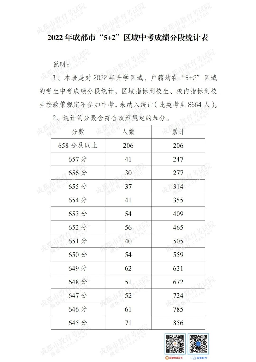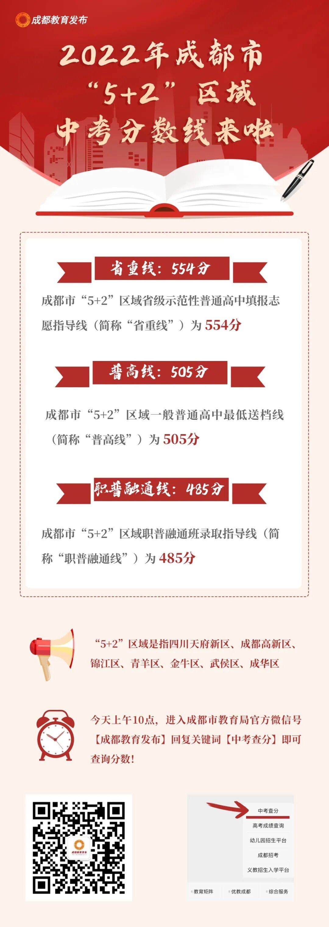 记者从成都市教育局获悉,2022年成都市“5+2”区域中考分数线出炉,具体如下: