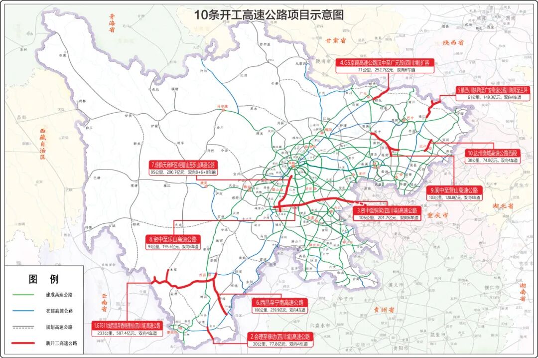 从功能看。高速公路建设等级高,速度快,是交通大通道、经济大动脉。此次开工的10个高速公路项目中,有5个是出川的通道性项目,占比达一半。其中,G7611线西昌至香格里拉、会理至禄劝高速公路将成为南向连接云南的大通道;G5京昆高速汉中至广元扩容项目是北向连接陕西的大通道;镇广高速川陕界至王坪段全线建成后,将成为陕西经四川到重庆的最便捷大通道,北向、东向兼顾;资中至铜梁高速公路则是东向出川通道,也是成渝地区双城经济圈内又一大通道,将进一步加强双圈互联互通。