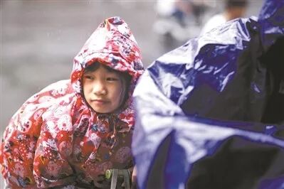 小女孩穿着雨衣,风雨中躲在大人的单车后座上。广州日报全媒体记者苏俊杰 实习生陈炳恒 摄