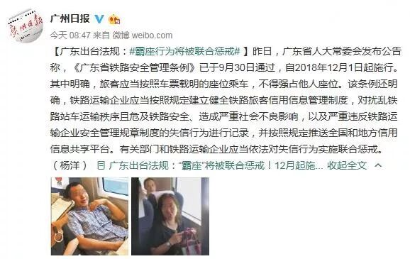 【广东出台法规:#霸座行为将被联合惩戒# 】昨日,广东省人大常委会发布公告称,《广东省铁路安全管理条例》已于9月30日通过,自2018年12月1日起施行。其中明确,旅客应当按照车票载明的座位乘车,不得强占他人座位。该条例还明确,铁路运输企业应当按照规定建立健全铁路旅客信用信息管理制度,对扰乱铁路站车运输秩序且危及铁路安全、造成严重社会不良影响,以及严重违反铁路运输企业安全管理规章制度的失信行为进行记录,并按照规定推送全国和地方信用信息共享平台。有关部门和铁路运输企业应当依法对失信行为实施联合惩戒。(杨洋)