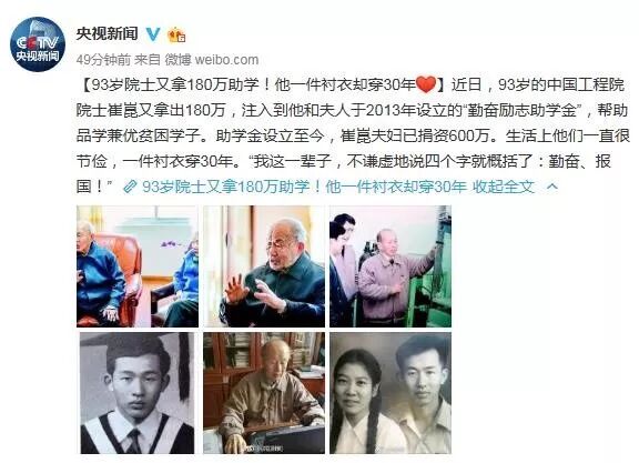 【93岁院士又拿180万助学!他一件衬衣却穿30年】近日,93岁的中国工程院院士崔崑又拿出180万,注入到他和夫人于2013年设立的“勤奋励志助学金”,帮助品学兼优贫困学子。助学金设立至今,崔崑夫妇已捐资600万。生活上他们一直很节俭,一件衬衣穿30年。“我这一辈子,不谦虚地说四个字就概括了:勤奋、报国!”