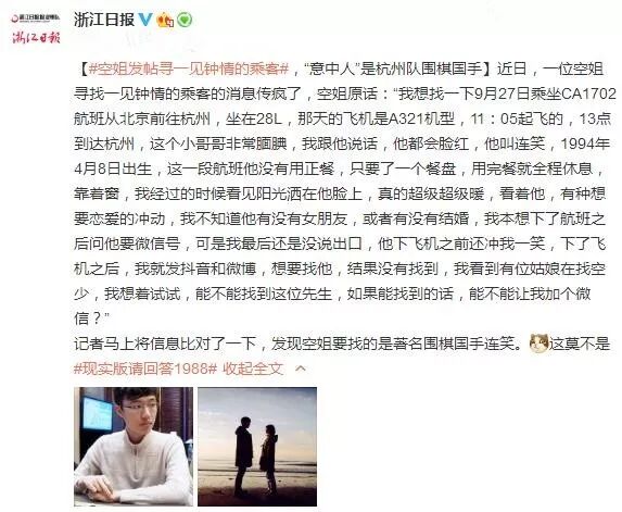 【#空姐发帖寻一见钟情的乘客#,“意中人”是杭州队围棋国手】近日,一位空姐寻找一见钟情的乘客的消息传疯了,空姐原话:“我想找一下9月27日乘坐CA1702航班从北京前往杭州,坐在28L,那天的飞机是A321机型,11:05起飞的,13点到达杭州,这个小哥哥非常腼腆,我跟他说话,他都会脸红,他叫连笑,1994年4月8日出生,这一段航班他没有用正餐,只要了一个餐盘,用完餐就全程休息,靠着窗,我经过的时候看见阳光洒在他脸上,真的超级超级暖,看着他,有种想要恋爱的冲动,我不知道他有没有女朋友,或者有没有结婚,我本想下了航班之后问他要微信号,可是我最后还是没说出口,他下飞机之前还冲我一笑,下了飞机之后,我就发抖音和微博,想要找他,结果没有找到,我看到有位姑娘在找空少,我想着试试,能不能找到这位先生,如果能找到的话,能不能让我加个微信?”记者马上将信息比对了一下,发现空姐要找的是著名围棋国手连笑。[喵喵]这莫不是#现实版请回答1988#