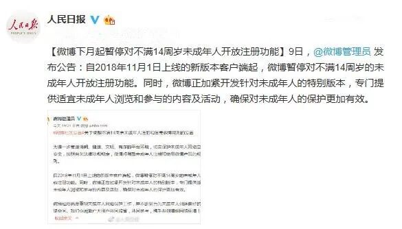 【微博下月起暂停对不满14周岁未成年人开放注册功能】9日,@微博管理员 发布公告:自2018年11月1日上线的新版本客户端起,微博暂停对不满14周岁的未成年人开放注册功能。同时,微博正加紧开发针对未成年人的特别版本,专门提供适宜未成年人浏览和参与的内容及活动,确保对未成年人的保护更加有效。