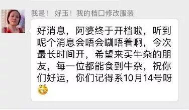 据悉,为了让一众粉丝能够及时知晓阿婆什么时候开档,街口车缝档的阿姨特地帮阿婆建立了牛杂粉丝群,每逢阿婆要开档,她就会提前一天在群里通知,让粉丝们能够“解馋”。