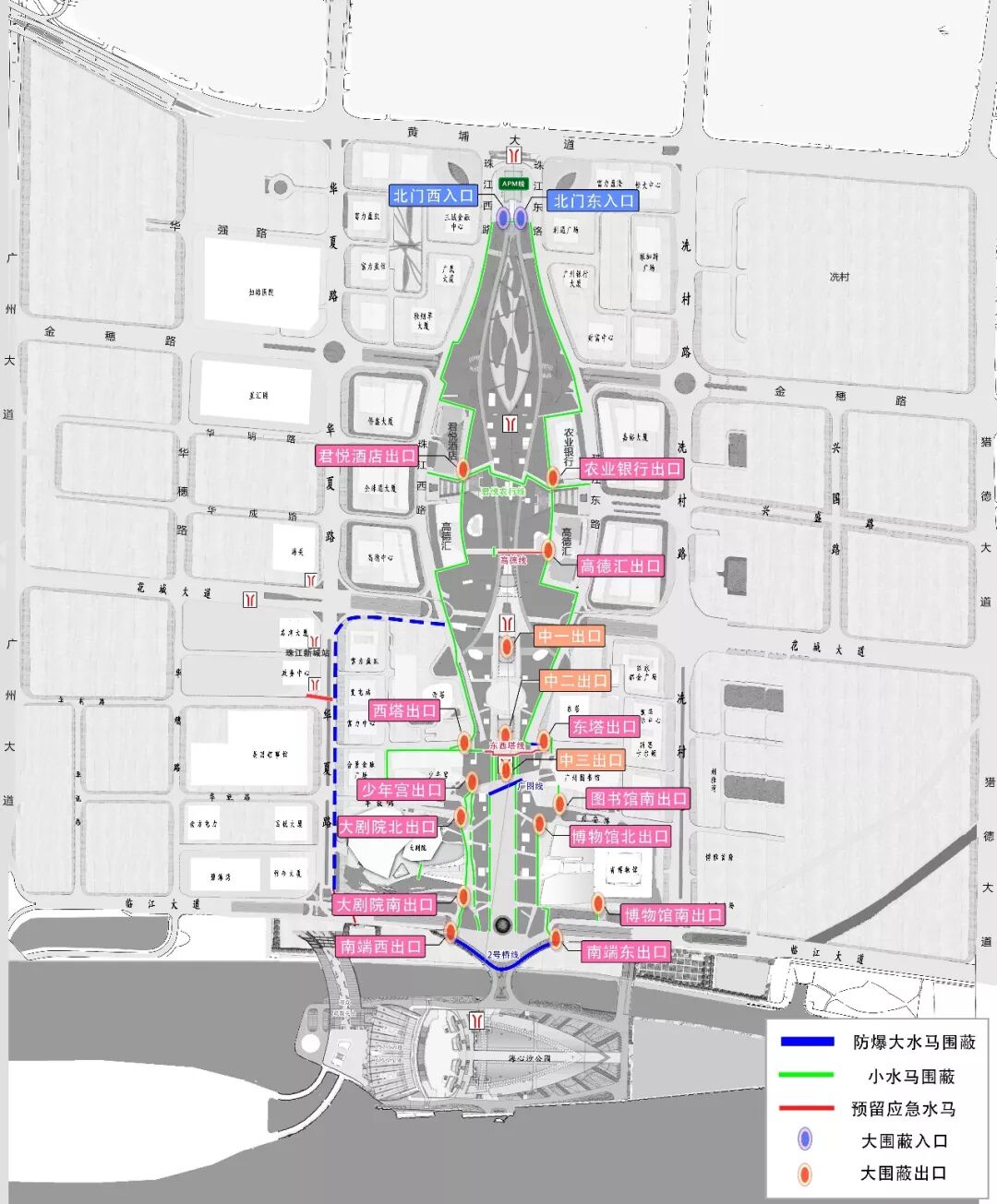 花城广场主会场设置2个入口通道,设在花城广场北广场靠近黄埔大道区域;