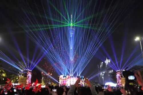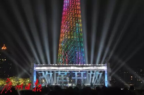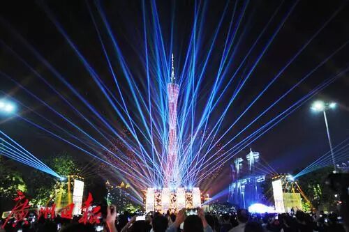 霎那间,五彩的激光束从广州塔和珠江新城中轴线的高楼大山间穿梭,勾勒出清晨太阳升起照亮广州的浩瀚画面,瞬间点亮了花城广场和广州塔广场。