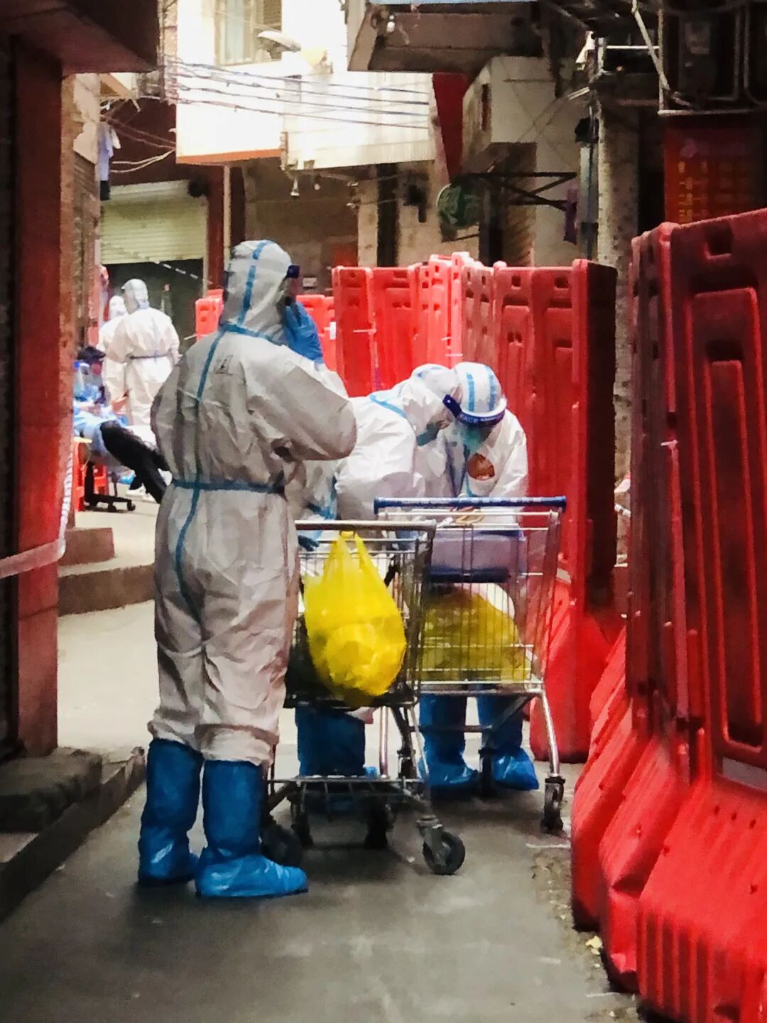 从中转点到居民楼栋由于道路狭窄,只能改用人力车甚至步行转运。超市手推车、平板车、小型三轮车……各种工具都派上了用场。转运点工作人员手上有一本厚厚的地址本,尽管经过十天的高强度工作,大家对一些地址依然要查询。