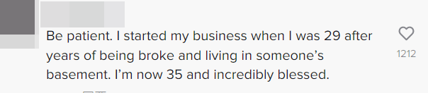 “要有耐心。我生活拮据、住在别人的地下室里,直到29岁才开始有自己的事业。现在我35岁了,我感觉好多了。”