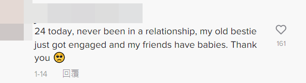 “我今天24岁了,我没谈过恋爱,我以前最好的朋友刚刚订婚了,我还有些朋友已经生孩子了。谢谢你(说的话)。”