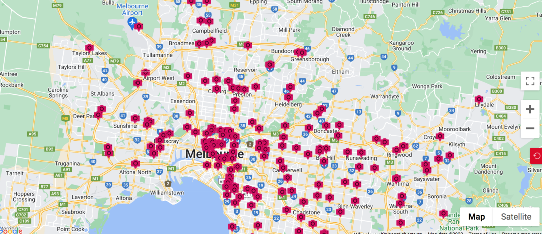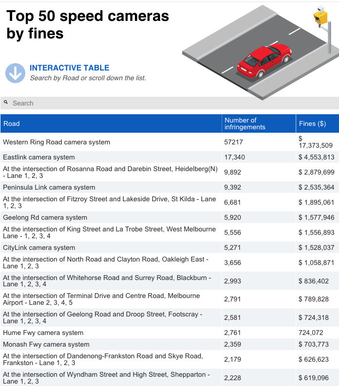 在三个月的时间里,总共向司机开出了 376,316 次罚款,超过 1 亿澳元。小饭帮大家截了个图,可以看一下维州前50收到罚金最多的摄像头在哪里哦~