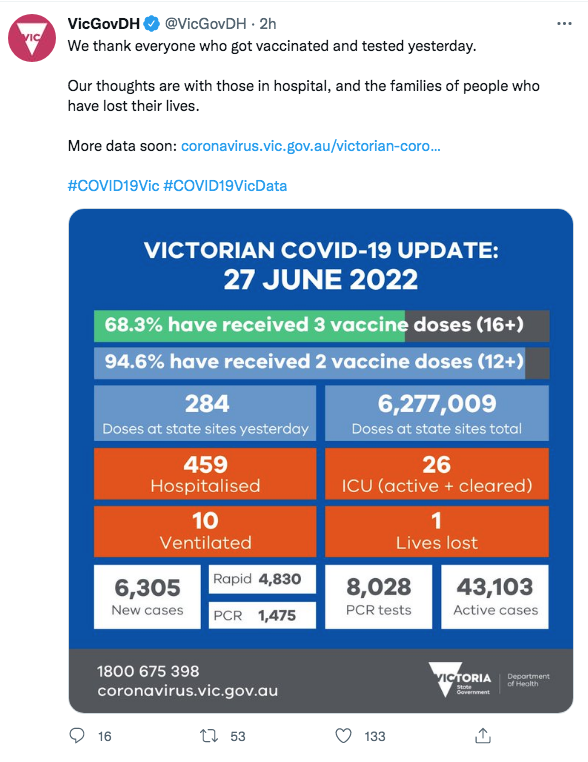卫生部警告说,这种新变种很快将成为维州的主要毒株。一份书面声明中说:“维多利亚州 BA.4/BA.5 的流行可能会导致病例增加——包括再感染——和住院人数。
