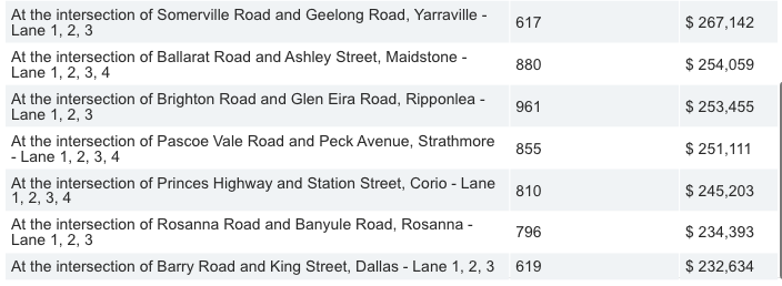 位于海德堡 Rosanna Rd 和 Darebin St 交叉口的摄像头排在第二位(以前是第一),总计近 10,000 起违规行为和价值 2,879,699 澳元的罚款。