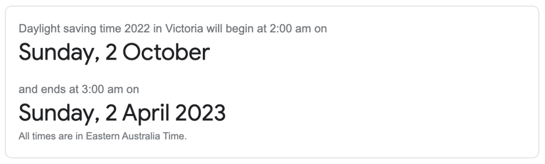 这意味着除西澳大利亚州、北领地和昆士兰州外,所有州和领地的时钟必须在 10 月的第一个星期日凌晨 2 点提前一小时。
