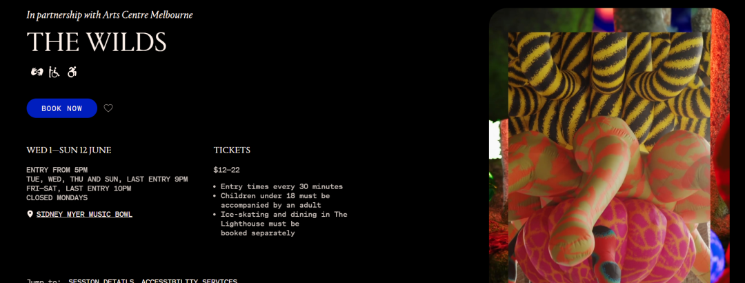 The wilds是rising最代表的秀场之一,这里融合了艺术、声音、味道和冰的艺术幻想。Sidney Myer 将会被进行一系列的改造,带给游客身临其境的感受,这里将会放置大量充气雕塑、魔幻的投影装置还有3D环绕背景音乐。