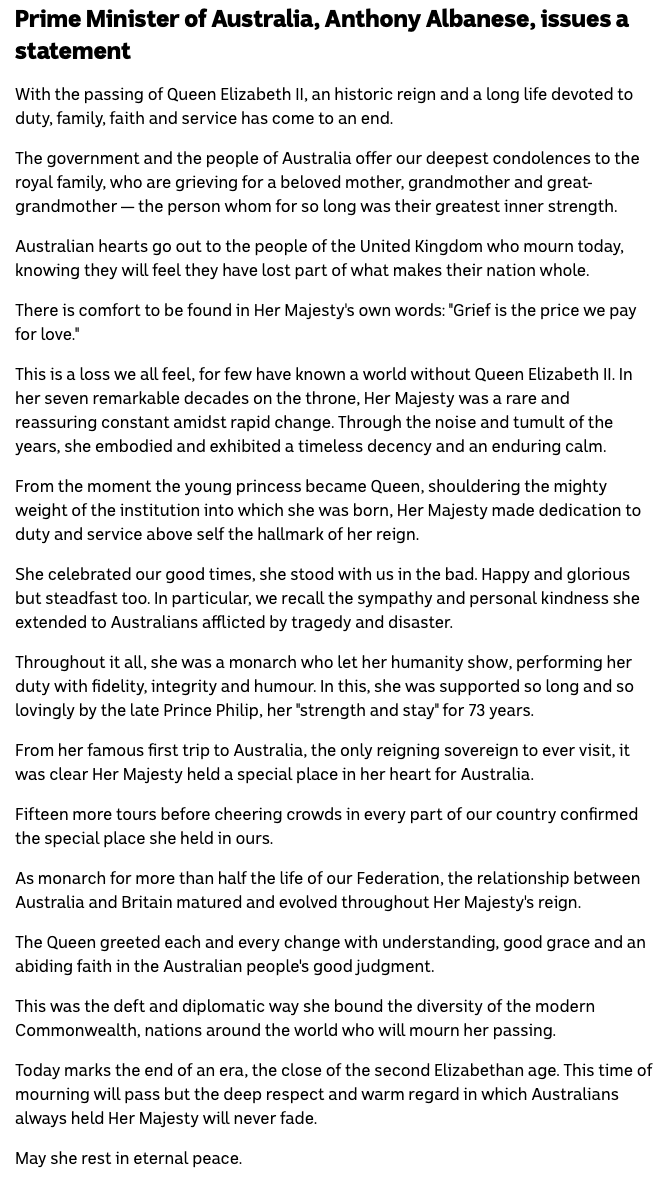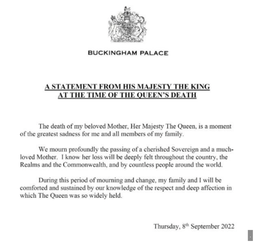 就伊丽莎白女王的去世发表了一份声明