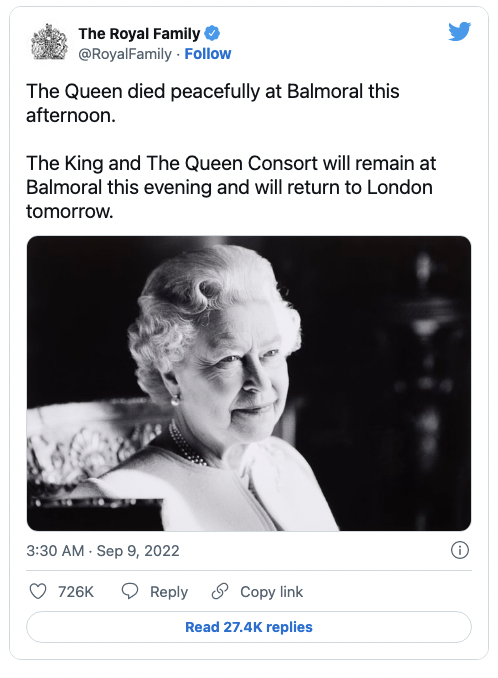 “女王今天下午在巴尔莫勒尔安详去世