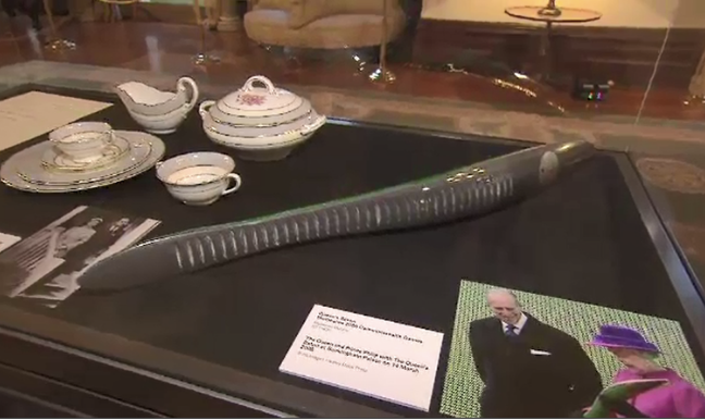 展览中的作品包括 2006 年英联邦运动会的女王指挥棒和她在 1954 年使用的一套餐具。还有女王陛下的肖像和1954年维多利亚第39届议会开幕的照片。