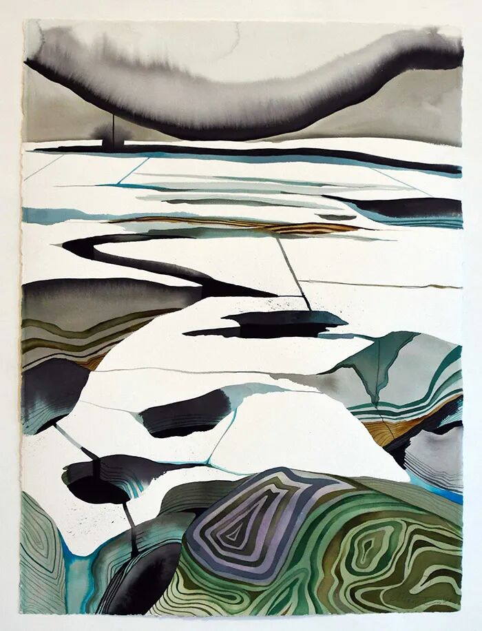 勒特文的水墨画系列始于2010年墨西哥湾原油泄漏事件前后。她关注环境变化问题,例如海平面上升和超级暴雨。这些现象令她开始想象末日景色,因此她的水墨画中会出现对大地倾覆、河流升空的抽象描绘。她的水墨技法也逐渐向着更简洁、更直截了当的方向进化。近期作品《红裂》(2020)和《地下青》(2020)几乎完全是单色作品,分别以不同层次的红色和青色呈现。单色经常用以强调冷暖、调性或情绪,以及时间的不同阶段。勒特文深思熟虑地控制着色彩的运用,希望凸显出暗与亮的关系。画面中,抽象的水流在虚与实的不同部分之间蜿蜒;暗部隐喻着自然界中的神秘主义和未知部分,而亮部隐喻着虚空和广阔无垠。水墨画的留白技法赋予了画面透明感,令暗与亮的关系更加明确切实。这一系列对形式的探讨较少,而更多在于对节奏变化的探索,通过绘画技巧中水墨的泄漏和倾倒来试验流动的本质。