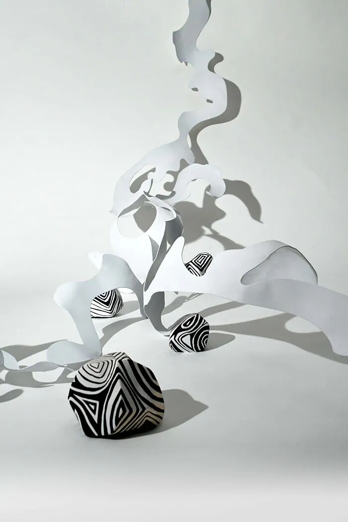 她的另一件场域特定装置作品《曲水》(2020)则体现了她对自然地景解构、演绎和再创造的兴趣。《曲水》的主体由数片白色的设色铝带组成,它们被弯折成数个形态自然的曲面,很容易令人联想起飞溅的水。它是一条抽象的河流,象征着流动的形式、节奏和时间,将观看者引领至抽象的景观和自然体验之中。古代中国哲学家老子的论述能够精准地描述作品中的诗意:“道法自然。”这件作品的观赏者能够自然地感知到物理空间和幻象空间的交错,以及随时间流逝而不断变化的周遭。