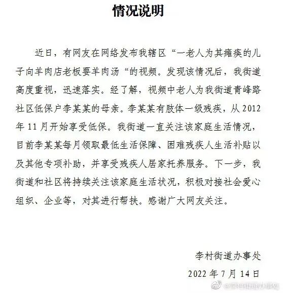 7月13日,一则拾荒老奶奶向羊肉汤店老板请求要剩羊肉汤的视频引发广泛关注。现场视频显示,一位头发花白老人向店主询问是否有剩的羊肉汤,请求店主给自己一些。视频中,老人称,她的儿子因事故高位截瘫,已瘫痪卧床10多年,一家人生活困难。