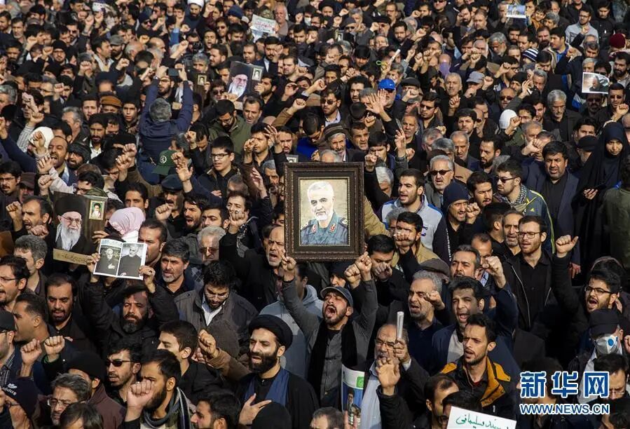 2020年1月3日,在伊朗德黑兰,人们参加游行抗议苏莱曼尼被炸身亡。新华社发(艾哈迈德·哈拉比萨斯摄)