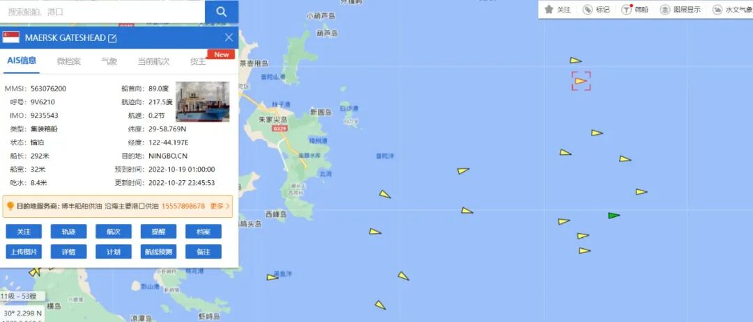 宁波港外锚地等待靠泊的集装箱船舶,状态显示为锚泊