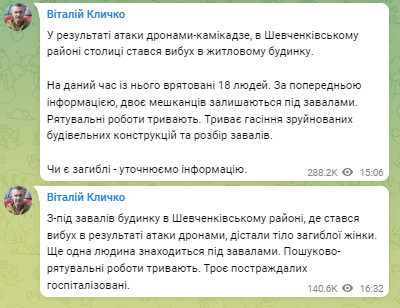 13时,克里琴科通报,舍甫琴科区一所房子的废墟中发现了一具女性遇难者遗体,此外,尚有一人被埋在废墟下。搜救行动仍在进行中。三名伤者已被送往医院。