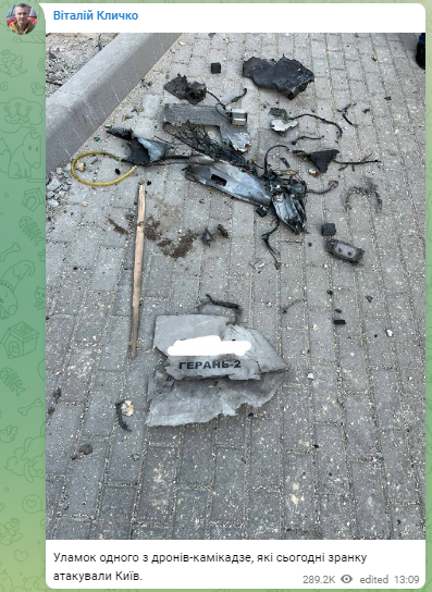 克里琴科还发出一张无人机残骸的照片,上有“герань-2”字样,并称该残骸为对基辅实施袭击的神风无人机。