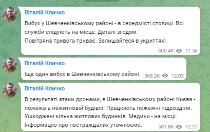 当地时间17日7时起,克里琴科多次通过Telegram发布基辅遭受无人机袭击的信息
