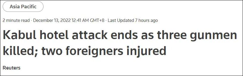 当地时间13日,极端组织“伊斯兰国”的分支机构“呼罗珊省”宣称对发生在阿富汗首都喀布尔的酒店袭击事件负责。12日下午,喀布尔一酒店遭爆炸袭击,3名袭击者当场死亡,另有2名外国人受伤。