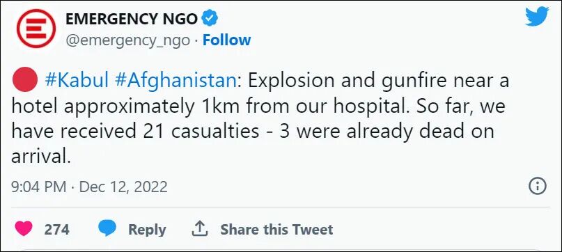 同时,塔利班任命的喀布尔警察局长发言人扎德兰说,该场袭击持续了几个小时。他说,警方的“恢复秩序”行动正在进行中。据了解,相关医疗救助组织表示,共有21人被送往医院,其中18人受伤,3人死亡。
