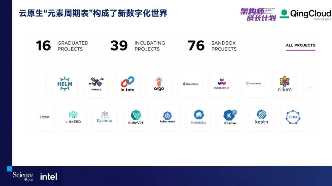 近几年,“云原生”这个词被提起的频率不断上升。Gartner报告指出,到2025年,有95%的全球化企业将在生产中使用云原生的服务化应用。不仅是互联网行业,制造、房地产、生物医药、政府等各行各业都将拥抱云原生技术。目前云原生的生态非常活跃,随着越来越多的应用在云原生平台中产生或迁移,与这些现有应用整合的需求只会不断增加。如何深度应用云原生应用,是衡量未来企业数智化能力、助力业务成功的关键。企业选择拥抱云原生的重点在于交付业务价值,构建和整合基础架构所产生的工作量不能成为负累。在此背景下,通过架构的设计和搭建选择适合企业自身业务的云原生项目,进而做到真正支持业务增长就变得尤为重要。由Science与英特尔联袂推出的“架构师成长计划”第二季系列课程,为您带来第四期——《用架构思维为云原生做减法》。本期课程邀请了青云科技云原生产品总监于爽、英特尔云基础设施软件研发总监王庆、CSDN创始人/总裁蒋涛共同研讨云原生技术的演进与落地应用,为相关领域的架构师们答疑解惑。2011年中国举办了第一届云计算技术大会,十多年过去了,企业上云已成为共识。最初的云计算1.0是将业务跑在服务器上,对应云平台、虚拟化等技术;之后,随着业务驱动,为降成本、增效能,云原生的相关技术应运而生。一项来自Gartner的2022年度分析报告中指出,云原生平台(Cloud Native Platforms)已经成为企业数字基建的必需品;报告预测,到2025年,云原生平台将成为95%以上新数字计划的基础,而在2021年这一比例尚不足40%,发展空间充分。云原生的整个生态非常活跃,各种新兴项目层出不穷,例如底层的计算调度平台Kubernetes(简称为K8s),往上层的边缘计算、各种网络项目、存储项目、Serverless项目等等,就好像一张丰富的“元素周期表”。企业如何去选择项目,更好地匹配业务,成为企业要面对的一道难题。![]()