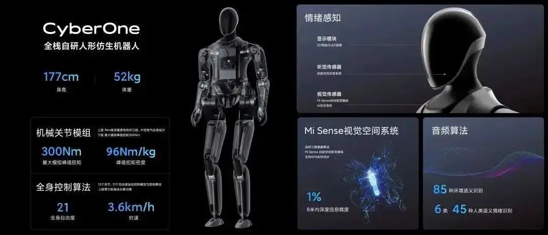 小米发布会上,雷军 发布了CyberOne全尺寸人形仿生机器人铁大。据介绍,该机器人目前具备成熟的学习能力,能感知 45 种人类语义情绪,分辨 85 种环境语义,可以控制全身 13 个关节,协调运动 21 个关节自由度,艺名为「铁大」。