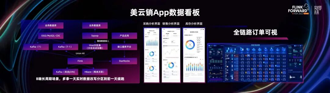 - B 端长周期场景:具体业务场景包括美云销 App 看板和全链路订单可视。传统行业的采购、营销、库存分析以及长周期订单的跟踪,都需要对过去很长一段时间的数据进行回溯,这对实时计算的挑战是比较大的。在我们的架构中,历史全量数据是通过 Flink 自动加载 Hive 分区表来引入的,与 Kafka 增量数据相结合,做进一步计算加工。