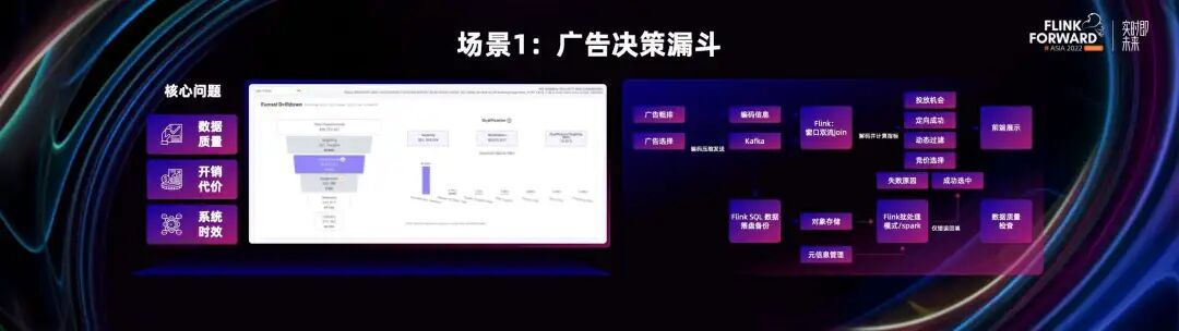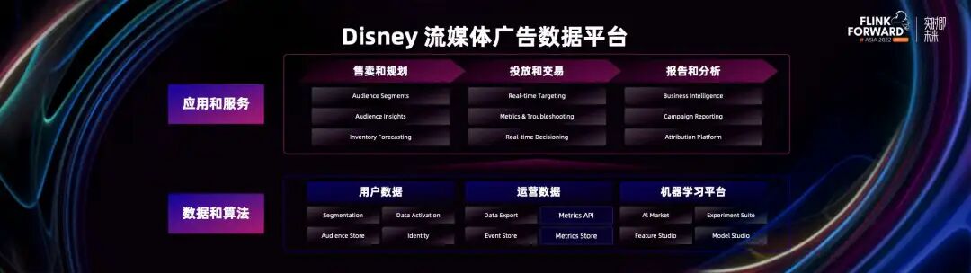 最后一场 Keynotes 议题是由 Disney 广告智能执行总监郝又超老师和 Disney 广告智能实时计算负责人李丁哲老师联合带来的。郝又超老师首先介绍了 Disney 流媒体广告业务。Hulu 作为美国本土头部的流媒体平台,最早是由 Disney、Fox、NBC 共同发起成立的。随着 2019 年对 Fox 的收购,Disney 得到了 Hulu 的运营控制权与广告平台的优质资源,开始发力线上流媒体,陆续推出 Disney+、ESPN+、Star+ 等品牌。目前,Disney 流媒体在全球有 2.35 亿订阅用户(以家庭为单位),已超过 Netflix。Hulu是当前 Disney 流媒体广告业务的主要来源,每天投放数亿15秒、30秒长的视频广告,而每选择一个广告都会产生几十甚至上百个事件,对数据平台有着极高的挑战,随着Disney+上12月份即将上线广告,这种挑战预期将数倍增长。Disney 流媒体广告数据平台分为数据算法和应用服务两层,其中 Apache Flink 主要应用于数据算法层,对运营数据中的关键指标做实时聚合。接下来,李丁哲老师分享了 Disney 流媒体广告数据平台中实时数据部分的具体情况。在实时链路中,从系统及用户侧收集到的数据,由 Flink 进行统一的流式计算,计算出的指标通过数据接口暴露给业务平台、运维平台、广告服务器等。在离线链路中,使用 Spark 生成离线报表和对外数据输出,使用 Flink 进行指标回填等处理。李丁哲老师还分享了 Disney 流媒体广告使用 Flink 的三个实时应用场景。广告决策漏斗:广告决策是一个复杂的过程,需要从庞大的广告池中,通过粗排、精排以及一系列过滤条件,选择出最适合用户的广告。为了对这个复杂的过程进行错误排查,我们将其抽象成漏斗模型,对广告的投放机会、定向成功与否、是否被过滤、最终是否投放成功、投放失败原因等信息进行展示。我们使用 Flink 将从广告服务器获取到的决策信息进行解码、关联,还原出决策漏斗并交由前端展示。在离线链路中我们实践了 Flink 的流批一体,使用同一套代码在实时数据出现问题时进行纠错与数据回填。- 广告曝光监控:广告主通常会提出一些广告投放的要求,比如针对特定人群投放、限制同用户同时间段内的投放次数、避免和竞品广告同时出现等。针对这些需求,我们研发了广告曝光监控平台,让广告主可以查看其广告投放的相关信息。在这个场景中,我们使用 Flink 对来自广告系统和客户端的上下文信息和用户行为进行关联和维度增强,生成一系列的事实指标,并基于特定规则计算出更多衍生指标。