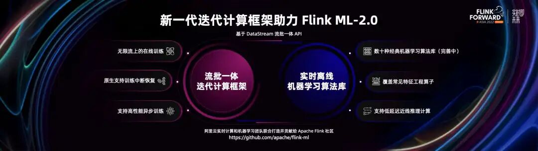Flink CDC 创新项目成长非常迅速,正在成为新一代数据集成引擎。目前 Flink CDC 已支持了包括 MySQL 家族、PolarDB、Oracle、MongoDB 等主流数据库且接入了增量快照框架,另外还支持了像 DB2、SQLServer、PostgreSQL、TiDB、OceanBase 等耳熟能详的数据库,相信今后也会有更多的数据源接入 Flink CDC 框架。该项目也获得了开源生态中开发者们的一致好评,Github Star 数已经超过 3,000。在老版本的 Flink 中有一个 Flink ML 模块,是一套基于 DataSet API 实现的机器学习算法库。随着 Flink 基础 API 层全部统一到流批一体的 DataStream API,原本的 Flink ML 模块也和 DataSet API 一同被废弃了。今年,Flink 社区基于 DataStream API 重新建设 Flink ML 成为一个新的子项目,目前已经发布了两个版本。众所周知,机器学习算法库运算的核心是迭代计算框架。Flink ML 2.0 基于 Flink DataStream API 重建了一套流批一体的迭代计算框架,能够支持无限流上的在线训练、训练中断恢复以及高性能的异步训练。Flink ML 2.0 仍处于起步阶段,第一批数十种算法已经由阿里云实时计算和机器学习团队完成了贡献,能够覆盖常见的特征工程场景,支持低延迟的近线推理计算。期待未来有更多公司和开发者能够参与进来,为 Flink ML 贡献更多经典的机器学习算法,让 Flink 优秀的计算能力在机器学习场景中发挥更大的作用。Apache Flink Next - Streaming Data Warehouse