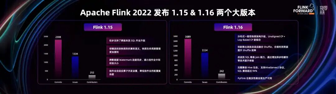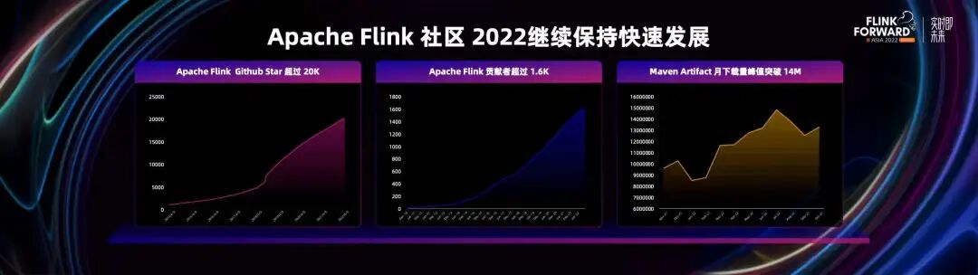 FFA 大会照例总结了 Apache Flink 过去一年的发展情况。2022 年,Apache Flink 社区继续保持快速发展:GitHub Star 数突破 2 万;代码贡献者总人数超过 1,600 人;单月下载量突破 1,400 万次。其中,Apache Flink 中文社区的发展尤为蓬勃:据 ossinsight.io 统计截至目前 Apache Flink 项目所有 PR 中有 45% 来自中国开发者;由 Apache 软件基金会授权、Apache Flink PMC 管理的官方微信公众号,2022年共发布了 130+ 篇技术分享文章,累计订阅用户数突破 6 万;新开通的微信视频号发布了36 篇视频,目前已有近 4,000 订阅用户。