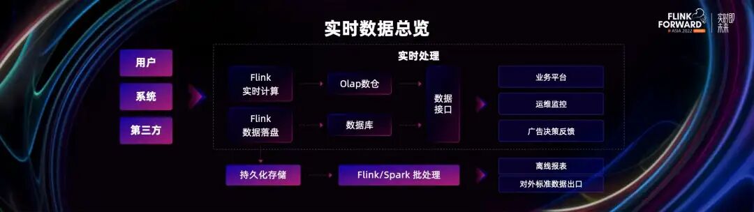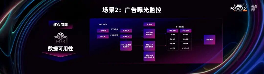 - 广告系统大屏:面相管理层与业务方,提供关于广告系统与广告投放情况的全局洞察能力。来自事实数据源的数据,经过 Flink 的处理,通过指标接口暴露出来,再根据不同的业务规则进行聚合,最终投放给前端做大屏展示。