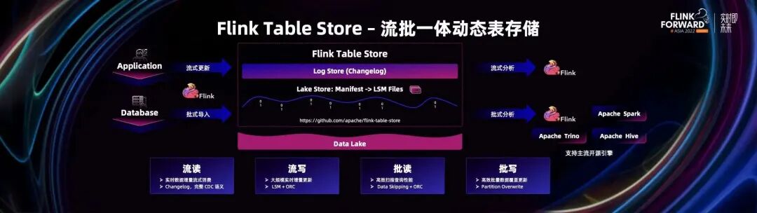 Flink 社区推出的全新子项目 Flink Table Store,其定位就是实现流批一体的存储能力,能够实现高性能的流读、流写、批读、批写。Flink Table Store 的设计遵循存算分离理念,数据存放在主流的云存储之上,其核心存储格式由 LakeStore 和 LogStore 两部分组成。LakeStore 应用了经典的 LSM、ORC 及其他索引技术,适合大规模、高性能的数据更新与读取。LogStore 提供了完整 CDC 语义的 ChangeLog,配合 Flink Streaming SQL 可以增量订阅 Table Store 进行流式数据分析。此外,Flink Table Store 采用开放的数据格式体系,除了默认对接 Flink 之外,也可以对接 Spark、 Hive、Trino 等主流开源计算引擎。Flink Table Store 诞生一年来,共推出了两个版本,完成了从 0 到 1 的孵化落地。目前除了阿里云之外,也有来自字节跳动等公司的开发者在参与共建和试用。我们对 Flink Table Store 和目前主流的数据湖存储 Hudi 进行了性能对比,结果显示 Flink Table Store 的更新性能明显领先 Hudi,查询性能明显领先 Hudi MOR 模式、接近 Hudi COW 模式,综合表现更佳。![]()