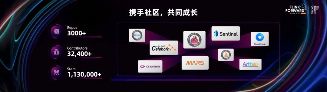 今天云与开源的迭代,也使得人们在开源软件的方向上有了新的探索。以 Flink 为例,最初是一个以 Java API 实现流计算的平台,在阿里巴巴内部及阿里云上的应用中逐渐生长出了像 SQL 这样的能力。近几年,阿里巴巴也在根据自身使用 Flink 的需求不断探索新的方向,例如在数据集成方向发展非常快的 Flink CDC 项目、和机器学习结合的 Flink ML 项目、与传统数仓相结合的流式数仓概念以及在此概念下推出的 Flink Table Store 项目等。此外,在整个大数据领域也有很多共性的技术,例如大规模分布式计算在存算分离环境中的 Remote Shuffle Service,在 Flink、Spark、Hive 等引擎中都有类似的需求。我们也很高兴地向大家宣布,阿里云已经将自身云场景中孕育的 Remote Shuffle Service 项目捐献给了 Apache 软件基金会,命名为 Apache Celeborn。
