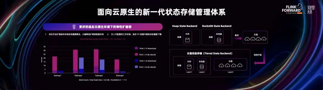 随着上述技术在 Flink 1.16 落地,Flink 形成了新一代的分布式一致性快照架构。云原生时代已经到来,各个基础软件项目都需要考虑如何去适应这样一个时代,Apache Flink 也不例外。对于 Flink 而言,云原生时代带来的最显著的变化是对于资源弹性扩缩容的诉求,这要求 Flink 作业的并发度能够随着业务量和资源不断改变。在并发度改变时,Flink 的状态存储也需要快速地重新分配,即状态存储的分裂与合并。因此,Flink 状态存储的分裂、合并性能,直接关系到 Flink 弹性扩缩容的体验。在 Flink 1.16 版本中,社区对 RocksDB State Backend 的状态重建算法进行了大量优化,取得了 2-10 倍的性能提升,使得 Flink 的弹性扩缩容更加平滑、更加适应云原生时代。此外,社区还计划将 Flink 状态存储管理体系进一步升级为彻底的存算分离架构,以适应云原生环境。目前 Flink 的状态存储管理体系并非真正的存算分离架构,所有状态数据依然存储在本地 RocksDB 实例中,只有在分布式快照时将增量数据拷贝到远程存储,保证远程存储中存有全量的状态数据。未来,Flink 的状态数据将全部原生于远程存储之上,本地磁盘与内存只用作缓存加速,形成分层存储体系,我们称之为分层状态存储(Tired State Backend)架构。流批融合的 Hybrid Shuffle 创新技术