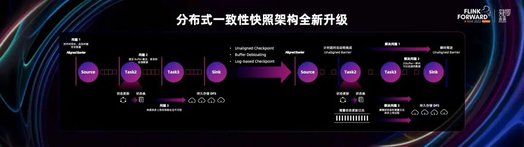 2022 年,Apache Flink 发布了两个大版本。在 Flink 1.15 版本中,社区集中解决了许多长期存在的历史难题,包括 SQL 作业的跨版本升级、状态快照的所属权语义与生命周期管理、跨数据源的 Watermark 进度同步、批作业自适应算子并发设置等。在 Flink 1.16 版本中,社区进行了更多新的创新与尝试,包括分布式一致性快照架构升级、创新流批自适应融合 Shuffle、基于异步与缓存技术的流式 SQL 维表 Join 改进、完整兼容 Hive 生态、PyFlink 功能及性能全面生产可用等。Apache Flink 作为一款有状态的流式计算引擎,分布式一致性快照是其非常核心的一项技术。Flink 在流计算过程中,定期对状态做快照并持久化,当作业出现异常时可以从最近一次快照进行恢复,以保证业务连续性。因此,能够以更高的频次、更低的成本进行快照,让业务更加流畅,是 Flink 用户的共同诉求。然而在真实生产环境中,特别大规模复杂生产环境中,分布式一致性快照面临着诸多挑战:一方面在反压状态下,网络缓冲拥塞,用于做分布式快照的 Barrier 无法沿数据流向下传输,无法及时触发快照;另一方面,即使能触发快照,需要持久化到远程存储系统的本地状态数据的数据量和上传时间均不可控。上述原因导致用户时常遇到无法在规定时间内生成分布式快照的情况,严重影响业务的稳定性。![]()