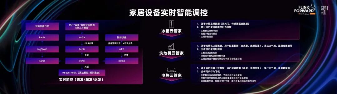 在美的新兴业务场景中,同样有许多基于 Flink 的实时数字化应用实践,在这方面董奇老师也分享了三个场景。家居设备实时智能调控:冰箱云管家、洗地机云管家、电热云管家等产品都具有分析用户行为、调整控制智能家电行为以达到节能节水目的的功能。Flink 消费 Kafka 中的设备数据,与 Redis / HBase 用户、产品、第三方数据以及算法模型、规则相关联,将结果再写出到 Kafka 中,最终通过 IoT 云完成设备指令的下发。此外,在这套链路中 Flink 还承担了实时监控的职能。