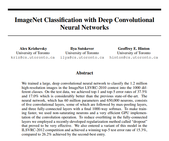 在这一年,论文《深度卷积神经网络的 ImageNet 分类》发布。论文作者之一,就是 AI 三巨头之一的 Hinton。