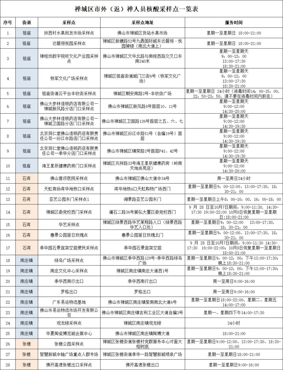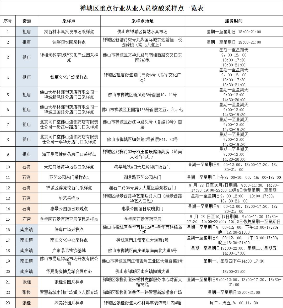 国庆假期前后,禅城区共计开设135个便民采样点、28个市外来(返)禅人员采样点以及23个重点行业从业人员采样点。相关采样点核验市外来(返)禅人员行程码,核查重点行业从业人员短信或工作证或凭证后统一提供免费核酸采样与检测服务。