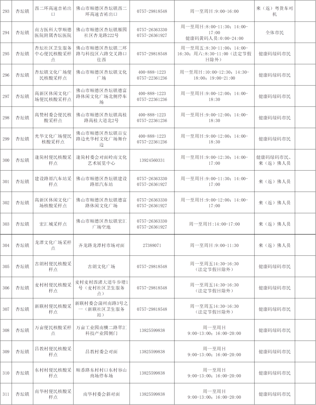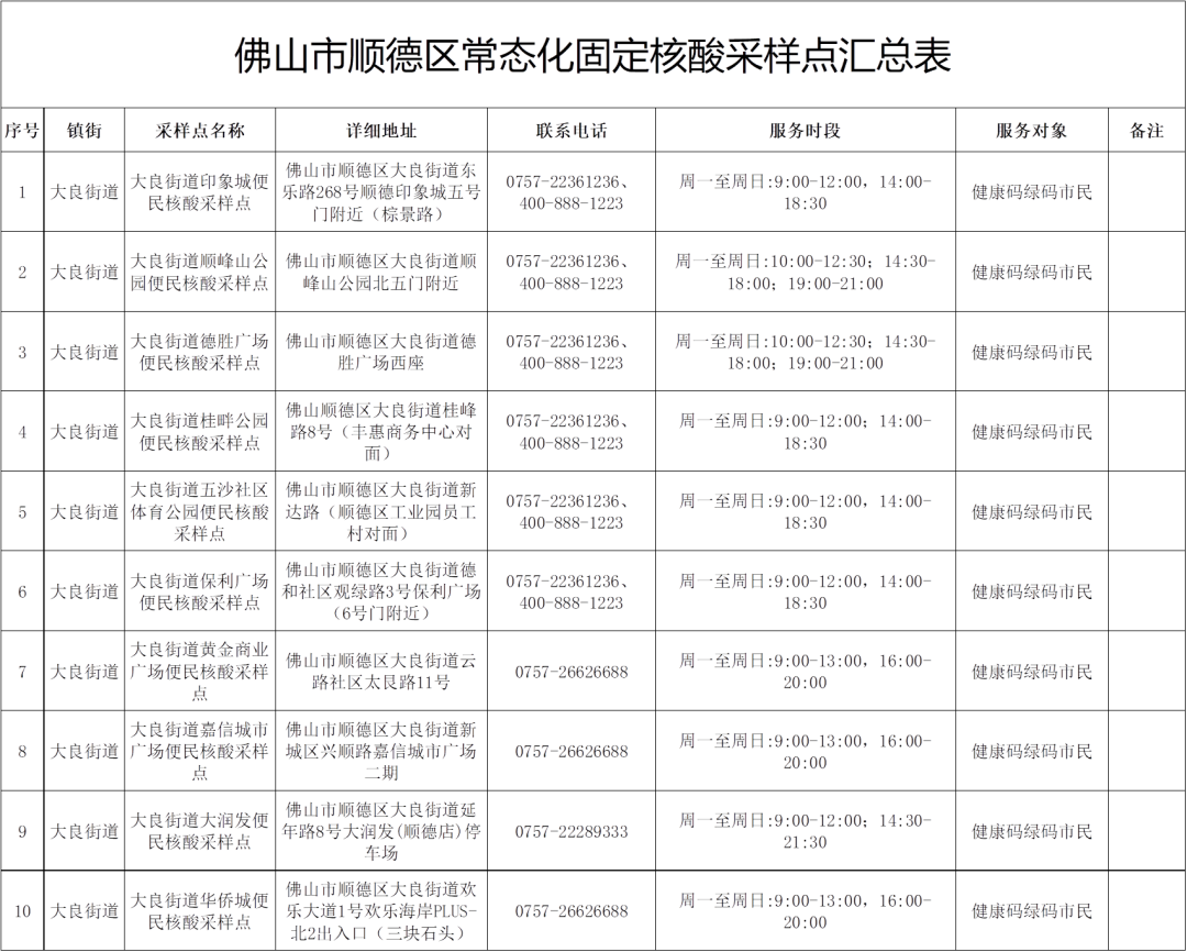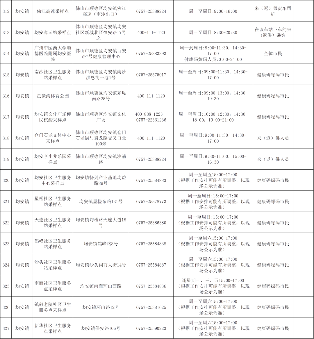 顺德区在10个镇(街道)共设置327个便民核酸采样点,服务对象覆盖来(返)佛人员、健康码为黄码人员、重点人群及其他有自费核酸检测需求人员。